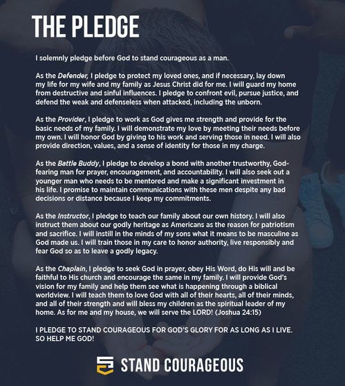 The Stand Courageous Pledge forms a full-length picture of how a man should view and think of himself with the goal of becoming that man. Consequently, the Pledge contains a series of commitments organized around the five principles of biblical manhood. In making this Pledge, our prayer is that God would do a transforming work in the heart of every man as you lead in your home, at work, in your church and community.